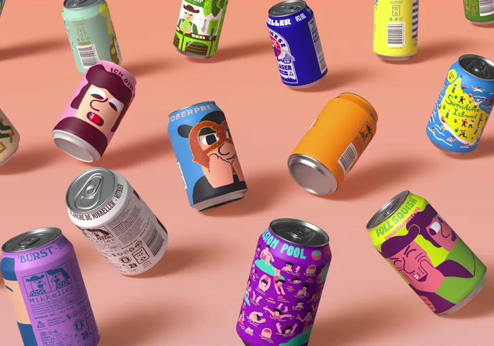 Mikkeller’s illustrated beer range is the most cited example: each can tells its own story through layered, character-driven illustration that’s recognisable from across a room. BrewDog’s specials packaging uses graphic layering for immediate shelf impact. This approach has become a practical way to communicate flavour, variety and brand personality simultaneously without overcrowding the design.